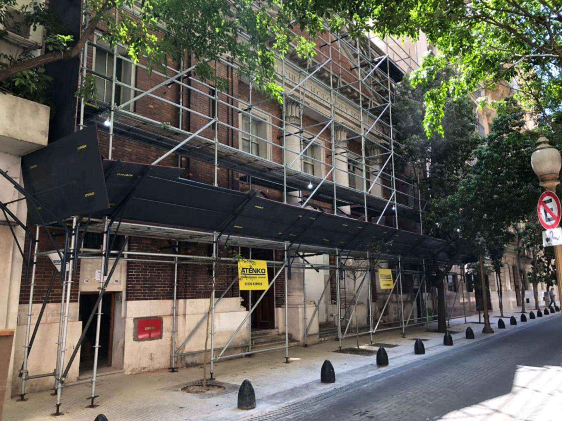 La PROTECCIÓN PEATONAL es adaptable a las necesidades de obra y puede ser una estructura independiente o formar parte del andamio de fachada, siendo en todos los casos cubiertos (por lo general con terciado fenólico) para detener o amortiguar posibles caídas de objetos.